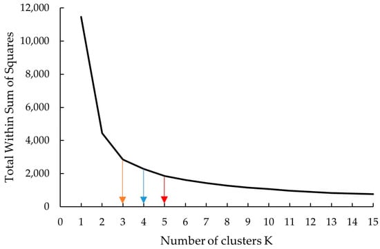 The choice of the optimal value K was based on the observation of the elbow in the plot of the total within-cluster sum of squares (TWSS), a clustering goodness measure, against a range of possible K values (from 1 to 15). The output elbow graph in Figure 4 shows two sharp corners at K = 2 and K = 3, then gradually declining until K = 5, making it hard to pinpoint the sharp elbow. We explored clustering using K = 2 (too few clusters, underfitting), giving a low quality of 61.2%, while K ≥ 6 (too many clusters, overfitting) output overlapping clusters. Thus, we selected the three values K = 3, 4 and 5 for an acceptable range to evaluate clustering quality and interpretation, as shown in Figure 4. The clustering goodness measures were 83.9% for K = 5, 80.1% for K = 4, and 75.1% for K = 3.