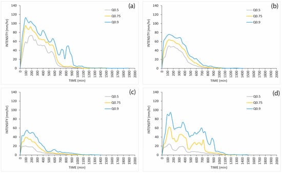 In Figure 5, RPSs for clusters T1, T3, and T4 had similar shapes; however, the signals differed significantly in duration, cumulative rainfall, and maximum intensity, as shown in Table 1. The T5 RPSs comprised multiple peaks with relatively low rainfall intensity. Notably, the flood response showed a higher result for Q0.75, as detailed in Section 3.3. Consequently, for the K = 4 and K = 3 clusters, the analysis exclusively derived RPSs at Q0.75 for subsequent flood model simulations. When using K = 5, eight RPSs are applied to run the flood model. By applying only Q0.75, the analysis yields three RPSs for K = 4 and two RPSs for K = 3. The derived RPSs for clusters resulting from the second iteration applying K = 3 were associated with lower values for the rainfall characteristics than when using K = 5 and K = 4.
