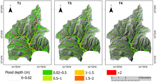 Flood depth maps for Grand Bay catchment on Dominica as simulated using the Q0.75 RPSs for clusters T1, T3, and T4 resulting from applying K = 4.