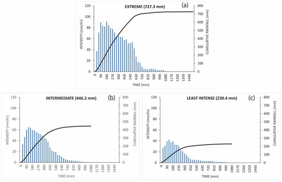 Precipitation time series (intensity/duration) and cumulative plots of the TC-associated rainfall scenarios for TS Erika resulting from K = 4. The blue bar graphs represent the half-hourly rainfall intensities, and the black line is for the cumulative precipitation. (a) Extreme, (b) intermediate, and (c) least intense.