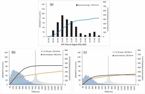 Plots of (a) the average hourly rainfall on Dominica due to TS Erika and the line plot of the cumulative rain from Table 1 of the report by [28]. Plots (b,c) compare the output cluster-based design events with the design storms derived from IDF curves available for the region in Figure 3 from [20] by applying the ABM. The line plots (b,c) are the corresponding cumulative rainfall, black for the output cluster-based design events and orange for the design storms.