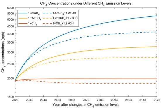 To quantify the impact of OH variation on methane, we first increase the OH source from the initial condition (Table 1) by 1.2 times and compare methane concentrations with the results of unperturbed ones from [46]. The solid lines in Figure 1 show the variation in methane concentrations from the unperturbed condition at different methane emission levels (1–1.5 times the initial emission rate). When a larger OH source (1.2 times the initial OH production rate) is imposed into the hydroxyl oxidation cycle, methane concentrations gradually decrease over time, although slowly in the early years due to the existing imbalanced CH4 budget (the CH4 budget needs to be reversed first), as can be seen from the dashed lines.