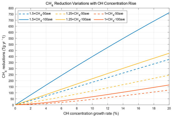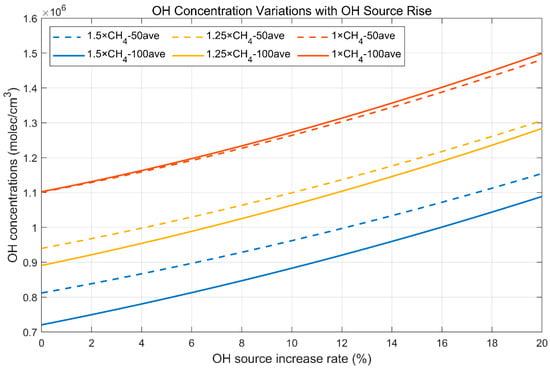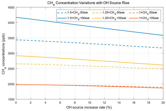 The 50 (100)-year-averaged variations in OH concentrations induced by increased OH sources can be seen in Figure 3. OH concentrations will increase when larger OH sources are put into the atmosphere despite different CH4 emission levels, but the change rate of OH concentrations are impacted by the CH4 emission levels. Higher levels of methane emissions will increase methane abundance, consume more OH, and suppress OH concentration, and vice versa [55]. This reduction (promotion) effect on the OH concentration is stronger with the higher (lower) methane emission level and longer suppression time. This is why the 100-year-averaged OH concentration is higher than the 50-year-averaged OH concentration (promotion effect) when methane emissions are at the current level. The reason is the same for the results of 1.5 times the initial emission level. The 50 (100)-year-averaged OH concentrations are calculated from .