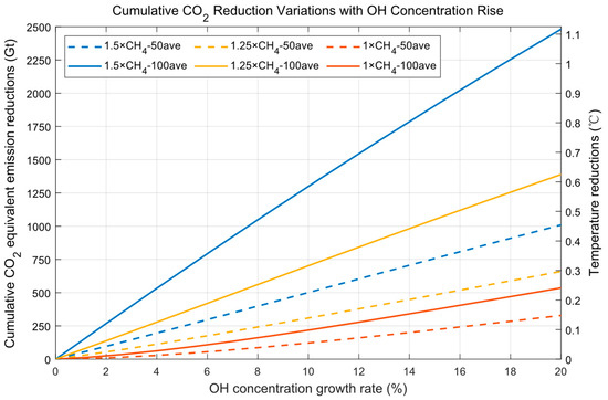 where is the conversion factor from mass of CH4 to CO2, is the molecular weight of species , and are the average CH4 concentration reductions from Figure 4 (in Tg yr−1), and and are the equivalent cumulative CO2 (shown from the left axis of Figure 5) for 50 and 100 years (in Gt) (1 Gt (gigatons) = 103 Tg (teragrams) = 1012 kg), respectively. Since the water vapor enhancement strategy only accelerates oxidation from CH4 to CO2 and does not completely eliminate CH4 (from the source), the oxidation production CO2 should be subtracted in Equations (8) and (9). is the global surface air temperature reduction due to CH4 concentration reduction (shown on the right axis of Figure 5). From Figure 5, cumulative CO2 equivalent reductions are greater at a higher level of CH4 emissions and over a longer time frame. If OH concentrations are raised by 10% from their original value and maintained for 50 years, the equivalent cumulative CO2 reductions are 120.5 Gt, 307.8 Gt, and 501.6 Gt at the current, 1.25 times the current, and 1.5 times the current methane emissions levels. The equivalent cumulative CO2 reductions are 219.6 Gt, 702.4 Gt, and 1296.3 Gt for 100 years. The corresponding decreases in global surface air temperature are , , and for 50-year equivalent cumulative CO2 reductions. For 100-year equivalent cumulative CO2 reductions, they are , , and .