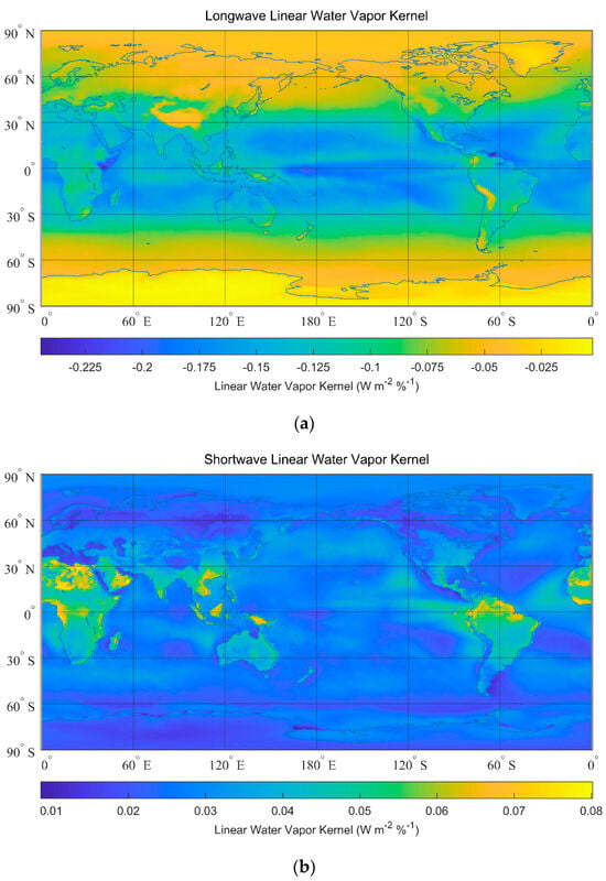 All-sky linear water vapor kernels. (a) All-sky longwave linear water vapor kernels (global mean: ). (b) All-sky shortwave linear water vapor kernels (global mean: ).