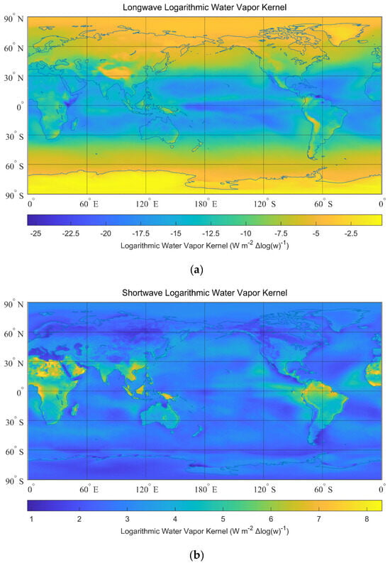 All-sky logarithmic water vapor kernels. (a) All-sky longwave logarithmic water vapor kernels (global mean: ). (b) All-sky shortwave logarithmic water vapor kernels (global mean: ).