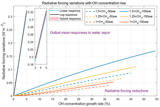 From Figure 8, the global mean radiative forcing increases from water vapor will exceed radiative forcing reductions due to methane removal (lower part of this figure) when the same rate of increase in OH concentration is required. From this perspective, removing atmospheric methane only by increasing water vapor content in the atmosphere may not be a good method. It should be noted that effective radiative forcing (ERF) may also be the parameter for comparison. ERF is an extended concept from SARF and is a change in net downward radiative flux due to changes in greenhouse gases accounting for adjustments not only in stratospheric temperature (SARF) but also in tropospheric temperature, clouds, and atmospheric circulation [1]. As the sum of adjustments is negatively proportional to SARF [74], the radiative benefits of methane reductions will be further below the penalty.