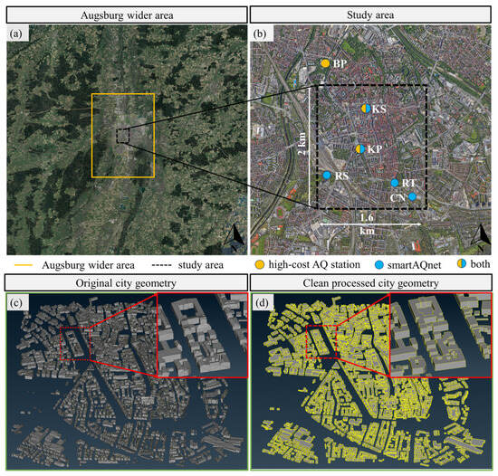 The case-study area covers a 2 × 1.6 km2 region containing a significant portion of Augsburg city. Figure 1a depicts the wider area of the city, and Figure 1b shows the boundaries of the study area and the location of the air-quality sensors. In the city of Augsburg, the smart air quality network (smartAQnet), a hybrid air-quality network containing low-cost sensors, is operating under the supervision of the Karlsruhe Institute of Technology and Augsburg University [19]. In the examined area, five low-cost sensors belong to smartAQnet: Karlstraße (KS), Königsplatz (KP), Rosenaustraße (RS), Rotes (RT), and container (CN), as shown in Figure 1b. Additionally, two high-quality monitoring stations at KS and KP are operated by the Bavarian State of Environment and give out indications of various pollutant concentrations such as CO, NOx, and PM10. On the northern side of the domain, an urban background monitoring station at Bourges-Platz (BP), 1.5 km from the city center, provides urban background concentration data.