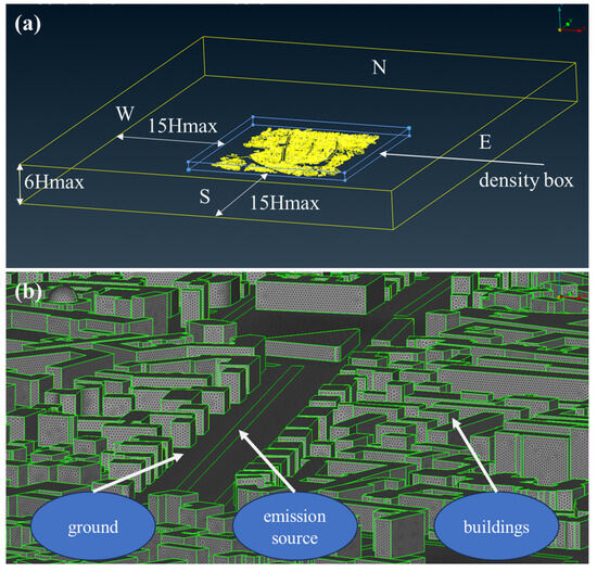 Computational domain developed according to common practices (a). Focus on computational mesh developed on the buildings, ground, and emission sources (b).