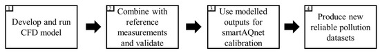 This paper aims to address the challenge of the quality of data used for calibration of low-cost sensors by introducing a novel approach: constructing dense datasets for calibration through computational fluid dynamics (CFD) air quality modeling. No other study was found to use a CFD model in combination with an existing urban air-quality sensor network. Unlike traditional calibration methods relying only on limited, high-quality measurements, this innovative approach uses CFD modeling, incorporating emission releases based on traffic activity, meteorological data, and reliable observations. CFD models offer high spatial accuracy of pollutant concentrations in 3D with respect to the geometrical configuration of the examined areas, making them ideal for urban air quality representation [14,15,16] as well as for environmental policy assessment [17,18]. By integrating validated 3D pollution maps derived from CFD modeling with local, reliable observations, this methodology introduces a novel way to provide aid for calibrating smartAQnet, a monitoring network situated in Augsburg, Germany. Ultimately, this method has the potential to improve the accuracy and reliability of low-cost air pollution monitoring in urban environments, merging the bottom-up and top-down approaches, leading to more reliable and cost-effective air quality assessment.