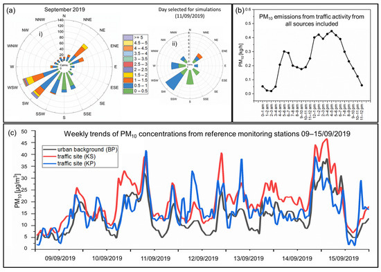 Rose graph indicating wind direction and wind speed of September (ai) and for the day selected for simulations (aii) in Augsburg. Traffic originating PM10 emissions from all traffic sources included in the model (b). Demonstration of measured PM10 concentrations observed by reference monitoring stations between 9 and 15 of September (c).