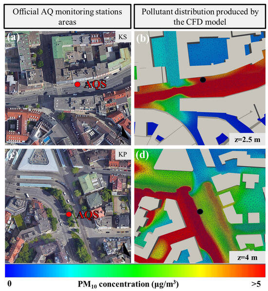 This section presents the outcomes of the CFD model regarding the modeled concentrations within the examined area. Figure 4b illustrates that the most severe traffic scenario, in terms of emitted mass, occurred between 16:00 and 17:00, with a prevailing wind direction from the southwest measured at 247 degrees. Hence, this scenario is chosen as representative for showcasing the CFD results in this section. All the simulations reached a level of residuals within the range of 10−6, indicating acceptable convergence as found in the literature [24]. Figure 5a depicts the location of the KS device on the northern side of the road at a height of 2.5 m, while the KP device (Figure 5c) is positioned at a 4 m height between two roads, capturing emissions from both east and west-bound traffic. Both stations are marked with a red dot. Figure 5b,d shows the respective locations on the model, along with the CFD-generated distribution of pollutant concentration. The corresponding point where the sensor is located in the digital model is indicated with a black dot.