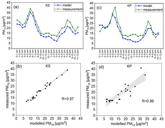 Comparison between modeled concentrations and official measurements for Karlstraße (KS) (a) and Königsplatz (KP) (c). Regression analysis between model and measurement for KS (b) and KP (d).