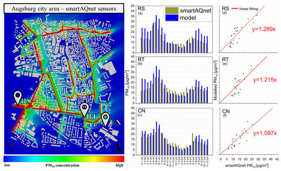 Figure 8a–c depicts an underestimation in PM10 levels on RS, RT, and CN sensors by smartAQnet throughout the day, compared to the model. During the examined timeframe, the disparities between the RS, RT, and CN sensors’ readings and the modeled PM10 concentrations were evaluated. The CN sensor exhibited an overall average difference of 1 μg/m3, while the RS and RT sensors showed differences of 4 μg/m3 and 3 μg/m3, respectively on PM10 concentrations. On average, the absolute deviations from the reference modeled PM10 concentrations amounted to 23%, 15%, and 9% for the RS, RT, and CN sensors. Figure 8d–f presents regression analyses conducted for each sensor. The correlation factors (R) established for RS, RT, and CN were 0.83, 0.81, and 0.85, respectively. These correlation factors indicate that the trends observed by the sensors in terms of PM10 concentrations align with the values produced by the model, but there are differences in the levels of concentrations produced.