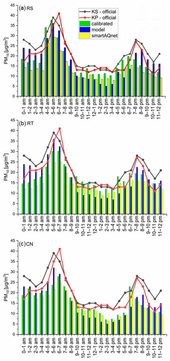 SmartAQnet PM10 concentrations, modeled PM10 values, and calibrated PM10 dataset for RS (a), RT (b), and CN (c), respectively, and indications of high-cost measurements from KS and KP during the examined 24 h period.
