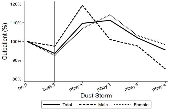 This study aims to address this research gap by investigating the potential connection between DS and RA outpatient visits. Utilizing a rigorous ARMA time-series regression model, we analyzed the 2006–2012 NHI database with DS data while controlling for air quality and ambient temperature data. Our findings reveal a notable positive correlation between dust storm occurrences and the utilization of RA outpatient services. Notably, males exhibited a significant increase in RA outpatient visits one day after DS onset, indicating a swift response to environmental pollutants. By contrast, this effect was not observed in females, highlighting potential gender-specific vulnerabilities. Despite a higher overall probability of RA incidence in females, our study underscores the heightened sensitivity of males to environmental pollutant risks.