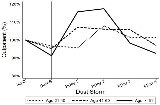The percentage analysis shows a consistent pattern, with daily RA outpatient visits surging by 10–15% on post-event days 1 and 2 compared to non-DS days (100%) across both female and total populations (Figure 1). Males exhibit a similar trend, with visits peaking on post-event day 1. Among those aged 61 and above, a substantial disparity emerges, with daily RA outpatient visits skyrocketing by 15–20% on post-event days 1 and 2 compared to non-DS days (Figure 2). The 41–60 age group shows consistent increases of 5–10% on post-event days 1–3. In the 21–40 age group, the probability of occurrence is lower, peaking on post-event day 2. These insights highlight the temporal influence of DS events on RA outpatient visits, emphasizing demographic variations.