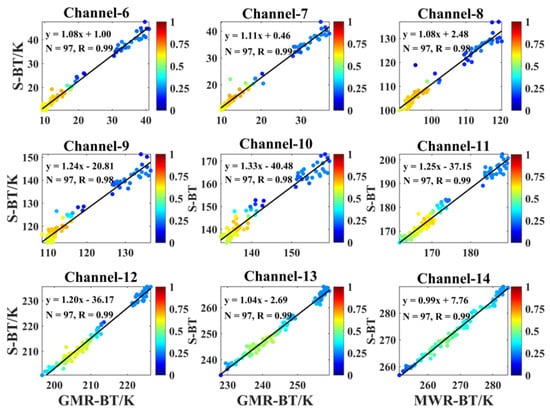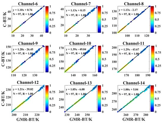 Figure 1 and Figure 2 show the fitted scatter plots of S-BT, C-BT, and GMR-BT for channels 6–15 of the microwave radiometer. The qualitative analysis of the two plots revealed that the S-BT and GMR-BT exhibited a significant correlation, which was even more pronounced for the C-BT.