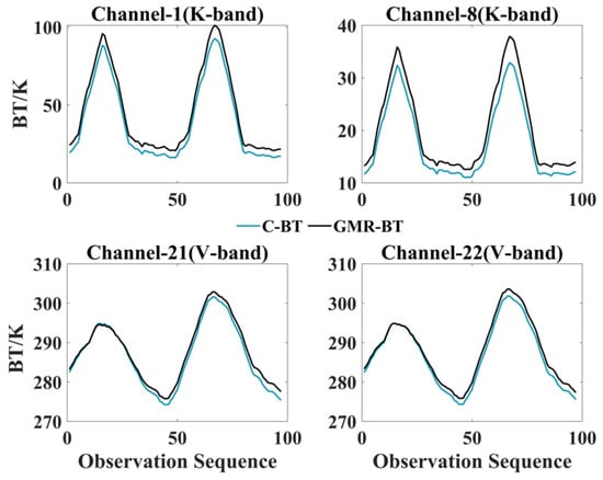 K and B are the slope and intercept in the linear function, where is the corrected simulated brightness temperature (C-BT), denotes the BT measured by the GMR (GMR-BT), represents the number of sample points, and denotes GMR-BT and S-BT sample points. The relation between the C-BT and GMR-BT is established in Table 3.