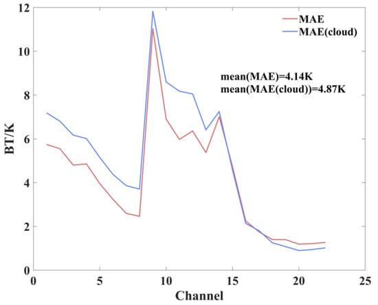 The quantitative analysis shown in Figure 5 revealed that the S-BT errors were significantly higher under cloudy conditions compared with clear conditions. The phenomenon was more evident in the first eight channels of the retrieval water vapor and the first five channels of the retrieval temperature. These channels were more sensitive to the water vapor information contained in the cloud. From a quantitative perspective, the average MAE was 4.14 K under clear conditions and 4.87 K under cloudy conditions. Additionally, the MAE showed a decreasing trend for the first eight channels of retrieval water vapor and the last four channels of retrieval temperature.
