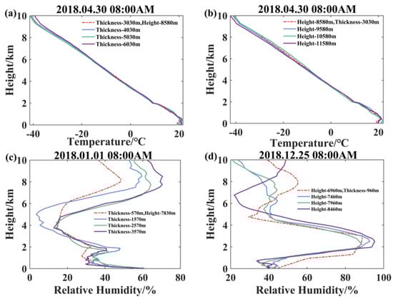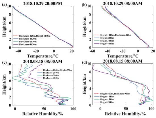 - The effect of different cloud-base heights and cloud thicknesses on the temperature profiles was not significant. However, for the relative humidity profiles, altering the cloud-base height and thickness led to significant changes in the relative humidity and its peak. Altering the thickness led to a significant increase in the relative humidity within the cloud layer. For low cloud conditions, when changing the cloud-base height or cloud thickness, 2 km is the critical height layer for significant differences in RH profiles; for high cloud conditions, the critical height layer is 4 km.