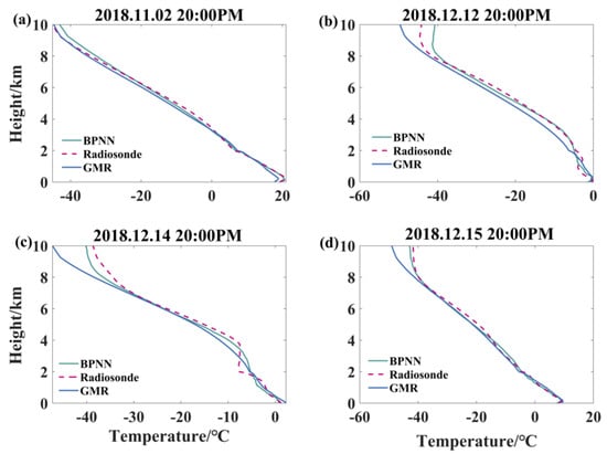 A comparison between the temperature profiles generated using the BPNN retrieval models, the GMR product, and the radiosonde under clear conditions at (a) 20:00 (UTC + 8) on 2 November 2018; (b) 20:00 (UTC + 8) on 12 December 2018; (c) 20:00 (UTC + 8) on 14 December 2018; and (d) 20:00 (UTC + 8) on 15 December 2018.