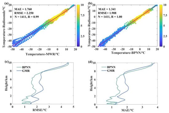 Figure 9 shows the fitted scatter plots and error plots under clear conditions, using the radiosonde data of Wyoming as the reference measurements. As can be seen, the retrieval temperature profiles demonstrated a significant fitting relationship with the radiosonde data. The GMR retrieval MAE was 1.7 °C, and the RMSE was 2.2 °C. The BPNN retrieval MAE was 1.3 °C, and the RMSE was 1.9 °C. This shows that the BPNN-coupled MonoRTM is more effective. As shown in Figure 9c,d, the RMSE values of the GMR fluctuated between 1.4 °C and 4.6 °C; the error gradually increased with increasing height, and the minimum and maximum values were obtained at around 0 km and 10 km, respectively. At 7.8 km, the RMSE value of the GMR started slightly lower than that of the BPNN, and the reason for this phenomenon is complicated; for example, there was still an error between C-BT and GMR-BT. However, since the difference between these two was less than 0.5 °C above 7.8 km, it did not affect the accuracy of the overall comparison of the temperature profile retrieval. The RMSE value of the BPNN retrieval fluctuated between 0.7 °C and 4.6 °C; the error gradually increased with increasing height, and the minimum and maximum values were obtained at 0.8 km and 9.75 km, respectively. In general, the trend of the MAE plot was the same as that of the RMSE plot. At the altitude of 0–7.25 km, the MAE value of BPNN was lower than that of the GMR, and at the altitude of 7.25–10 km, the two errors were close to each other.