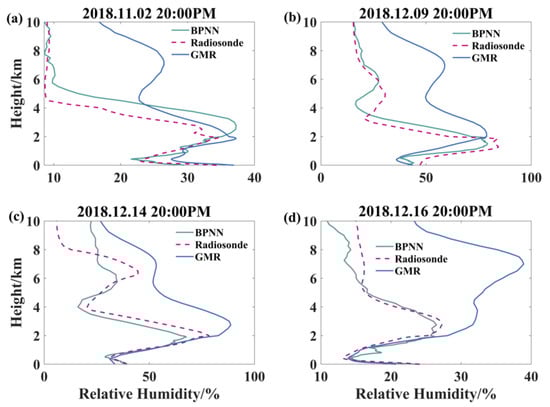 A comparison between the relative humidity profiles generated using the BPNN retrieval model, the GMR product, and the radiosonde under clear conditions at (a) 20:00 (UTC + 8) on 2 November 2018; (b) 20:00 (UTC + 8) on 9 December 2018; (c) 20:00 (UTC + 8) on 14 December 2018; and (d) 20:00 (UTC + 8) on 16 December 2018.