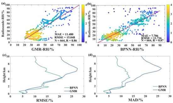 Using radiosonde data as reference measurements, a comparison of the BPNN retrieval models and the GMR product under clear conditions for (a) the GMR and radiosonde data relative humidity profile scatter plots; (b) the BPNN and radiosonde data relative humidity profile scatter plots; (c) the RMSE of the relative humidity profiles; and (d) the MAE of the relative humidity profiles.