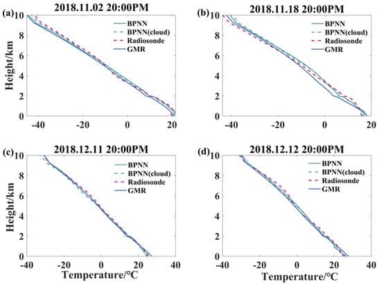 A comparison between the temperature profiles generated using the BPNN and BPNN (cloud) retrieval models, the GMR product, and the radiosonde under cloudy conditions at (a) 20:00 (UTC + 8) on 2 November 2018; (b) 20:00 (UTC + 8) on 18 November 2018; (c) 20:00 (UTC + 8) on 11 December 2018; and (d) 20:00 (UTC + 8) on 12 December 2018.