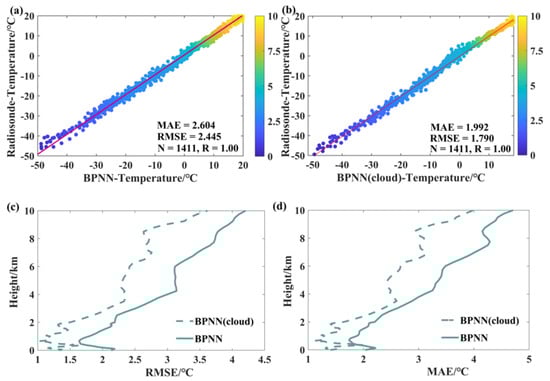 Figure 13 illustrates the fitted scatter plots and error plots of the temperature profiles before and after the addition of cloud information, using the sounding data as reference measurements. Figure 13a,b shows that in the cloudy samples, the MAE (BPNN) was 2.6 °C, RMSE (BPNN) was 2.4 °C, MAE (BPNN (cloud)) was 1.9 °C, RMSE (BPNN (cloud)) was 1.7 °C, and the accuracy of the temperature profiles was improved to some extent after the addition of the cloud information. As shown in Figure 13c,d, the addition of cloud information significantly improved the accuracy of the temperature profiles at an altitude of 0~10 km. Without the addition of cloud information, the RMSE and MAE of the BPNN retrieval fluctuated between 1.6 °C~4.2 °C and 1.7 °C~4.7 °C, respectively, and the minimum and maximum values were obtained at 0.65 km and 10 km, respectively. However, with the addition of cloud information, the RMSE and MAE fluctuated between 1.0 °C~3.6 °C and 1.1 °C~3.9 °C, respectively, and the minimum and maximum values were the same as those without the cloud information. At an altitude of 0~3.5 km, the changes in error before and after the addition of cloud information were small, and the error became larger at an altitude of 3.5 km~10 km. At around 7.75 km, the accuracy of the temperature profiles received the greatest improvement, and the RMSE and MAE errors both decreased around 1.0 °C after the addition of cloud information.