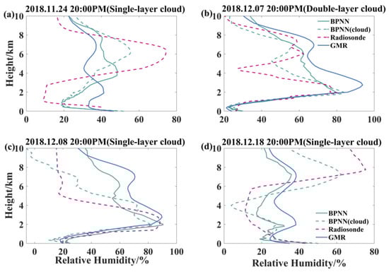 A comparison between the relative humidity profiles generated using the BPNN and BPNN (cloud) retrieval models, the GMR product, and the radiosonde under cloudy conditions at (a) 20:00 (UTC + 8) on 24 November 2018 (single-layer cloud: cloud-base height: 5190 m; cloud thickness: 2100 m); (b) 20:00 (UTC + 8) on 7 December 2018 (double-layer cloud: cloud-base height: 2850(330) m; cloud thickness: 5970(1560) m); (c) 20:00 (UTC + 8) on 8 December 2018 (single-layer cloud: cloud-base height: 1170 m; cloud thickness: 540 m); and (d) 20:00 (UTC + 8) on 18 December 2018 (single-layer cloud: cloud-base height: 6240 m; cloud thickness: 3450 m).