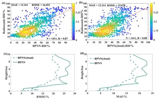 Figure 15 shows the scatter plots fitted to the sounding data and error plots of the RH profiles under cloudy conditions. The retrieval errors can be seen in Figure 15a,b: the MAE (BPNN) was 13.1%, RMSE (BPNN) was 16.6%, MAE (BPNN (cloud) was 12.2%, and RMSE (BPNN (cloud) was 15.0%. The inclusion of cloud information reduced both the sample MAE and RMSE. The analysis in Figure 15c shows that the RMSE of BPNN and BPNN (cloud) retrieved RH profiles fluctuated in the ranges of 6.2~27.8% and 4.6~19.9%, respectively, with the minimum and maximum values of the errors at the ground and at around 7 km. At the altitude of 0~1 km, the error of BPNN was slightly lower than that of BPNN (cloud); meanwhile, the errors of BPNN were higher than that of BPNN (cloud) in the altitude range of 2~10 km. Above 1 km, the inclusion of cloud information significantly improved the accuracy of the RH profiles.