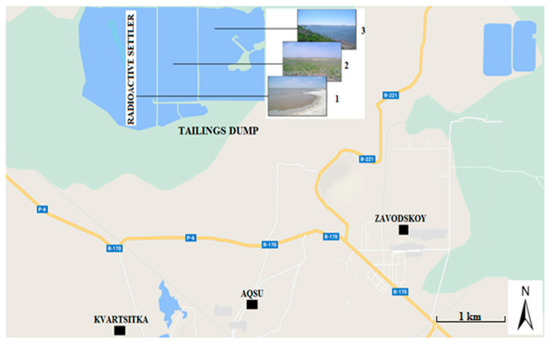 Scheme showed settlements location near the HMP tailings site, where 1—tailings dump evaporation pond; 2—pond 2; 3—pond 3.