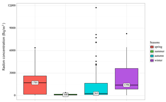 Figure 2 shows a comparative analysis of radon concentration in the seasons spring (March, April, and May), summer (June, July, and August), autumn (September, October, and November), and winter (December, January, and February). According to the data obtained, when comparing radon concentrations, statistically significant differences are revealed depending on the season (p < 0.001) (applied method: the Kruskal–Wallis test).