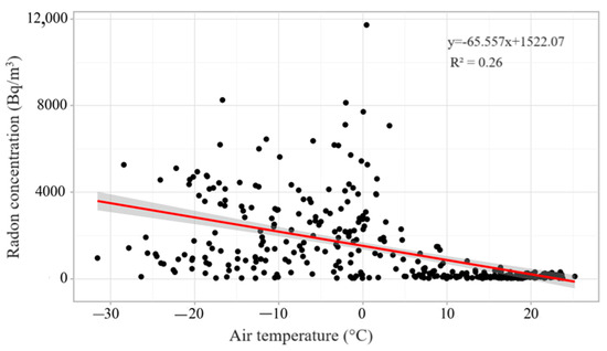 As it can be seen from Figure 3, with a 1 °C decrease of air temperature, a 65.56 ± 27.36 Bq/m3 change in radon concentration should be expected, for which there was a close correlation (by the Chaddock scale). According to the coefficient of determination R2 of the resulting model, 26.1% of the observed variance of radon concentration was explained. According to prior studies, in the summer, the radon concentration is lower than in the cold period of the year [9]. This is due to the fact that during the warm period, especially on hot days, the premises are often ventilated and there is also no stack effect, which allows for reducing the concentration of radon in the premises. These data are confirmed by the anticorrelation between the outdoor air temperature and the radon concentration inside residential premises. In winter, with the strengthening of the stack effect caused by higher temperature differences between the internal and external environment, the concentration of radon increases.