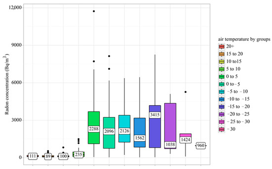 For a detailed analysis of the relationship between the outside air temperature and the radon concentration, the outside air temperature was divided into groups. Based on the data obtained during the analysis of radon concentration, depending on the outside air temperature by groups, statistically significant differences were revealed depending on air temperature by groups (p < 0.001) (applied method: the Kruskal–Wallis test). Figure 4 shows a comparative analysis of radon concentration and outside air temperature by groups.