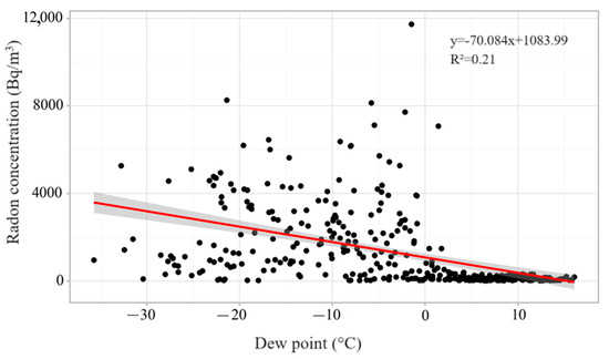 In the studies of a number of authors, the dew point temperature also negatively correlates with the radon concentration in the premises [13,18]. With a 1 °C decrease of dew point, a 70.08 ± 25.40 Bq/m3 change in radon concentration should be expected, for which there was close correlation (by the Chaddock scale). According to the coefficient of determination R2 of the resulting model, 21.4% of the observed variance of radon concentration was explained.