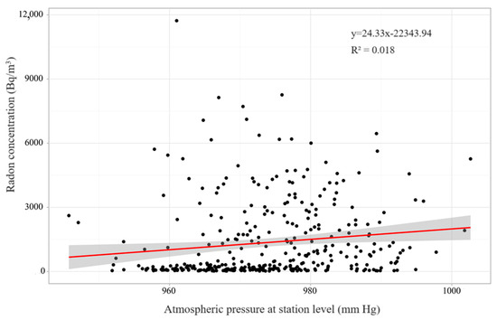 As it can be seen from Figure 6, a weak correlation positive association between radon concentration and atmospheric pressure at station level was estimated. With a 1 mm Hg increase of atmospheric pressure at station level, a 24.33 ± 9.52 Bq/m3 change in radon concentration should be expected, for which there was a weak correlation. According to the coefficient of determination R2 of the resulting model, 1.8% of the observed variance of radon concentration was explained.
