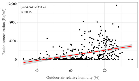 Figure 7 shows a correlation analysis of the association between air humidity and radon concentration.