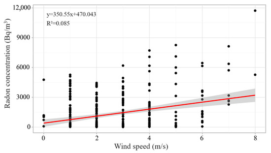 As it can be seen from Figure 8, a weak correlation and positive association between radon concentration and wind speed was estimated. With a 1 m/s increase of wind speed, a 350.55 ± 115.42 Bq/m3 change in radon concentration should be expected, for which there was a weak correlation. According to the coefficient of determination R2 of the resulting model, 8.5% of the observed variance of radon concentration was explained.