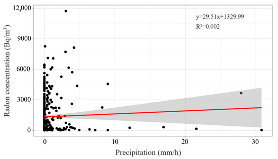 Figure 9shows a weak correlation positive association between radon concentration and precipitation was estimated. With a 1 mm/h increase of precipitation, a 29.50 ± 9.57 Bq/m3 change in radon concentration should be expected, for which there was close correlation (by the Chaddock scale). According to the coefficient of determination R2 of the resulting model, 0.2% of the observed variance of radon concentration was explained. Indicators of radon concentration and precipitation have statistically significant differences: radon concentration increases with precipitation of 0–1.9 mm, and with an increase in precipitation, radon concentration decreases. This is because, with a low moisture content, the process of radon emanation increases with an increase in soil moisture [40,41], which leads to an increase in the radon flux density. With a high moisture content, radon output to the surface is prevented by water in the pores, i.e., water shields the radon output from the ground, therefore, the radon flux density decreases [38]. Precipitation saturates the soil and prevents the release of radon due to the deterrent effect [42,43]. The release of radon from the soil depends on the amount of precipitation, and the radon diffusion coefficient increases with temperature [44].