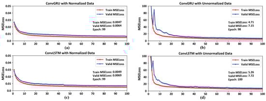 The MSELoss curves during the training of ConvGRU and ConvLSTM. (a): The MSELoss curves during the training of ConvGRU with normalized data; (b): The MSELoss curves during the training of ConvGRU with unnormalized data; (c): The MSELoss curves during the training of ConvLSTM with normalized data; (d): The MSELoss curves during the training of ConvLSTM with unnormalized data.