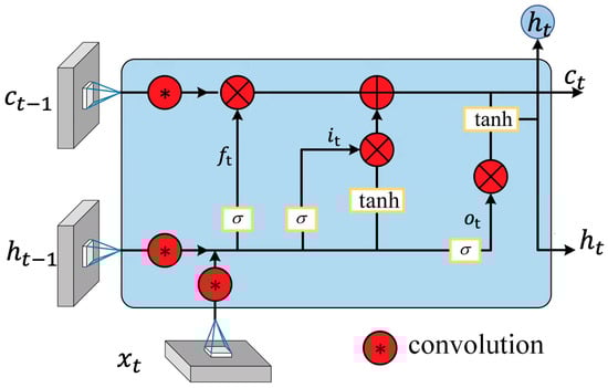 The ConvLSTM model adopts the sequence-to-sequence recurrent network architecture proposed by Sutskever et al. in 2014 [], which was first extended to the field of spatiotemporal data prediction by Srivastava et al. in 2015 []. In our ConvLSTM network, all input states , memory states , hidden states , and various gating signals are manifested as three-dimensional tensors . Here, the first dimension represents the number of channels for the input data transformed into image data or the channels of hidden state features. The latter two dimensions represent the rows M and columns N of the hidden states in spatial scale, which can be envisioned as vectors of length P standing on a spatial grid with an area of M × N. The structure of the ConvLSTM unit is illustrated in Figure 3.