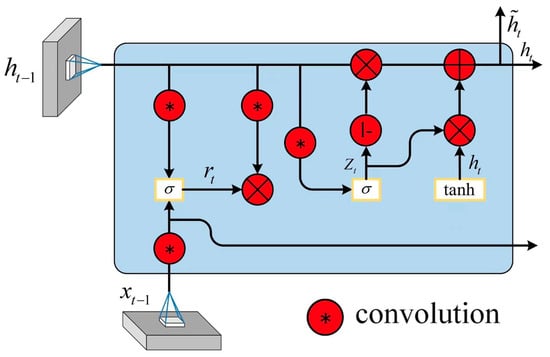 The ConvGRU network represents a structural simplification over the ConvLSTM network. Ballas et al. [] embedded the convolutional network into the Gated Recurrent Unit (GRU) [] to achieve unified modeling of fine-grained spatiotemporal information. Besides retaining the capability to address long-term dependencies, the ConvGRU network features a simpler architecture, fewer parameters, and enhanced operational speed. The structure of the ConvGRU unit is illustrated in the Figure 5 below.