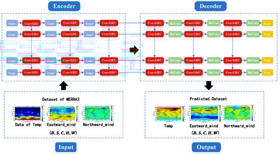 In our study, to investigate the differences in the capabilities of ConvLSTM and ConvGRU for processing spatiotemporal sequence data, the network structures and parameter settings of the proximate spatial environment forecasting models based on both are made identical. The network structure of the model based on ConvGRU also consists of four parts, with the only modification being the replacement of the ConvLSTM unit with a ConvGRU unit. The specific design is illustrated in Figure 6.