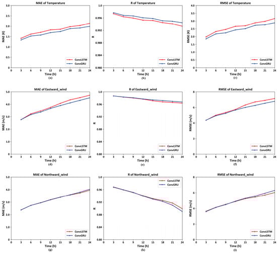 In terms of timing, the input data cover eight time segments per day, exemplified by the intervals at 03:00, 06:00, 09:00, 12:00, 15:00, 18:00, 21:00, and 24:00 on 2 January 2022. The output consists of predicted values for the corresponding eight-time segments on the following day, 3 January 2022, at the same time. By calculating the Mean Absolute Error (MAE), correlation coefficient (R), and Root Mean Square Error (RMSE) for these eight time points against actual data (from MERRA2), it was observed that both models demonstrated a trend of decreasing predictive accuracy with increasing time span. Moreover, the model trained using ConvGRU units performed better than that using ConvLSTM units. This finding aligns with the conclusions drawn by Shi et al. in their study, which indicated superior performance of ConvGRU [].
