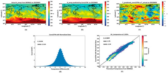 As illustrated in Figure 8, (a) shows the actual temperature data on 3 June 2022, at the 1.65 Pa isobaric surface height from the MERRA2 dataset. (b) displays the temperature data for the same date and isobaric height, predicted by a model trained using a deep learning neural network based on the ConvLSTM unit, utilizing the MERRA2 data from 2 June 2022. (c) is the pseudocolor map of the difference between actual temperature and predicted temperature. (d) indicates the average and root mean square errors between the actual temperatures across all 72 isobaric surfaces globally on 3 June 2022, and those predicted by the ConvLSTM-based model. Lastly, (e) presents the correlation coefficient, average error, and root mean square error between the actual and predicted temperature values at the 1.65 Pa isobaric surface height.