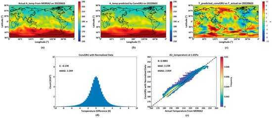 As illustrated in Figure 9, (a) shows the actual temperature data on 3 June 2022, at the 1.65 Pa isobaric surface height from the MERRA2 dataset. (b) displays the temperature data for the same date and isobaric height, predicted by a model trained using a deep learning neural network based on the ConvGRU unit, utilizing the MERRA2 data from 2 June 2022. (c) is the pseudocolor map of the difference between actual temperature and predicted temperature. (d) indicates the average and root mean square errors between the actual temperatures across all 72 isobaric surfaces globally on 3 June 2022, and those predicted by the ConvGRU-based model. Lastly, (e) presents the correlation coefficient, average error, and root mean square error between the actual and predicted temperature values at the 1.65 Pa isobaric surface height.