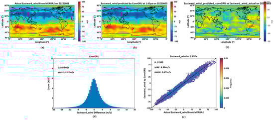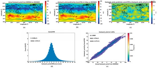 Figure 11 depicts, (a), actual eastward wind data from the MERRA2 dataset on 3 June 2022, at the 1.65 Pa isobaric height. (b) features data predicted by a deep learning neural network built with ConvGRU as the foundational element, using data from 2 June 2022, from the MERRA2 dataset. (c) is the pseudocolor map of the difference between actual temperature and predicted temperature. (d) details the average error and RMSE for actual versus predicted eastward winds across all 72 isobaric levels globally on 3 June 2022, by the ConvGRU model. (e) provides the correlation coefficient, average error, and RMSE for actual and predicted eastward winds at the 1.65 Pa level.